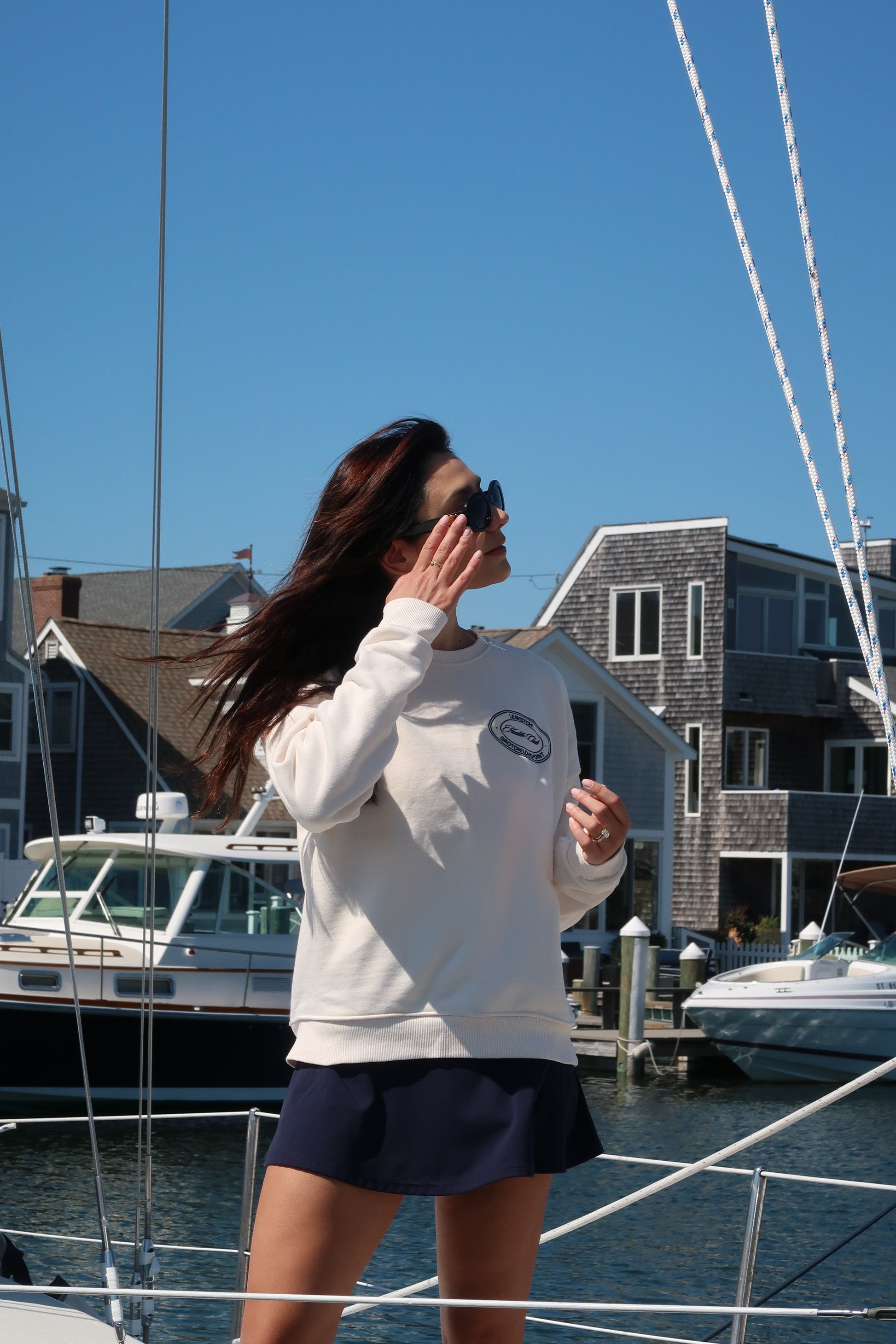Born from the heritage of Groton Long Point - GLP, a U.S. East Coast heaven of sailing, tennis courts by the shore, lobster dinners at dusk. This off-shoulder sweater, knit in 100% heavy-weight cotton reflects that understated luxury.